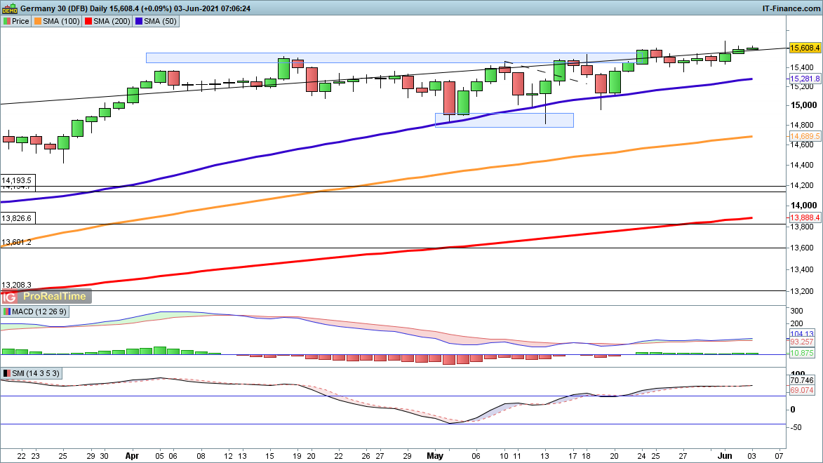 Here, too, a move through Tuesday’s peak has yet to develop, although the price continues to head in that direction. As with the FTSE 100, sellers have not been able to reassert control as yet, and will need a close back below 15,400 to put a more bearish spin on the short-term outlook.