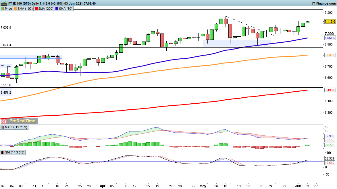 The FTSE 100 continues to be one of the more consistent performers this week, making forward progress at a time when others have struggled. It has yet to firmly surpass Tuesday’s opening highs but the direction of travel is still to the upside and leaves 7167 in focus. Sellers will need to see a reversal back below 7000 to suggest a change in short-term trend is at hand.