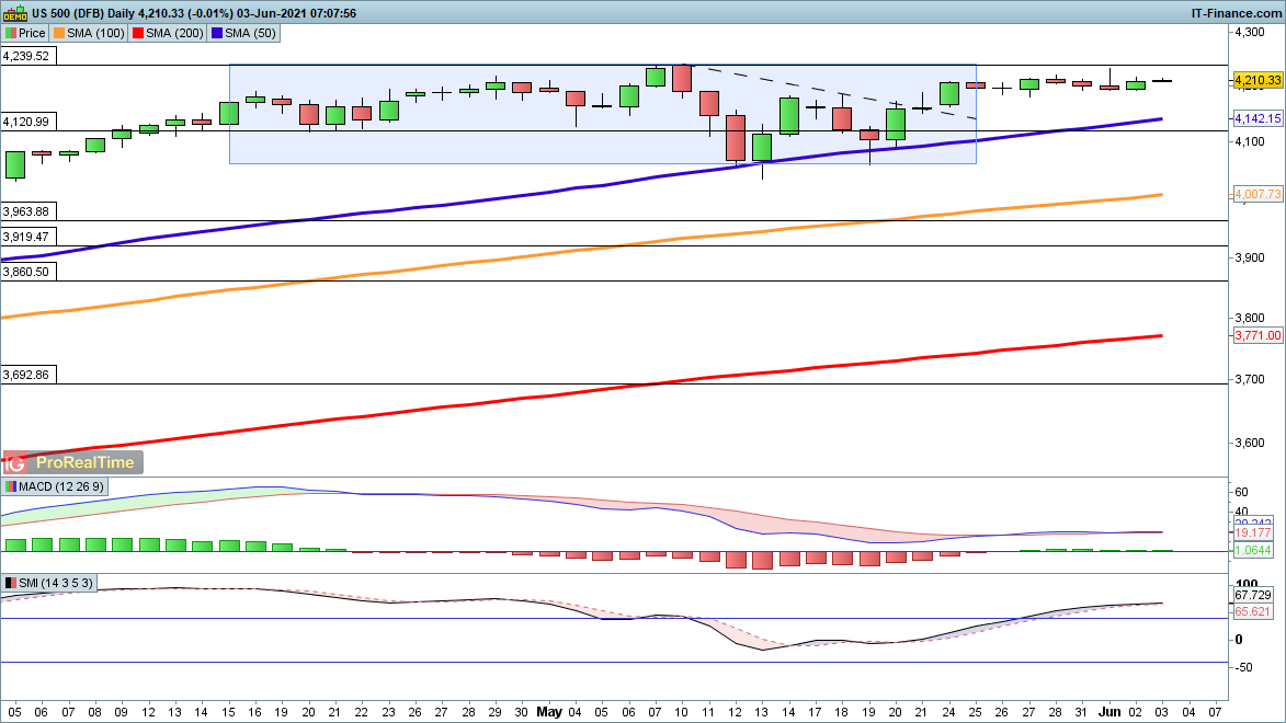There has not been much enthusiasm regarding a move to new highs for the S&P 500, the lack of macro data leaving traders bereft. A solid move above 4240 continues to elude us for the time being, but as with the other two indices the sellers are not able to stamp their will on the index as yet either.