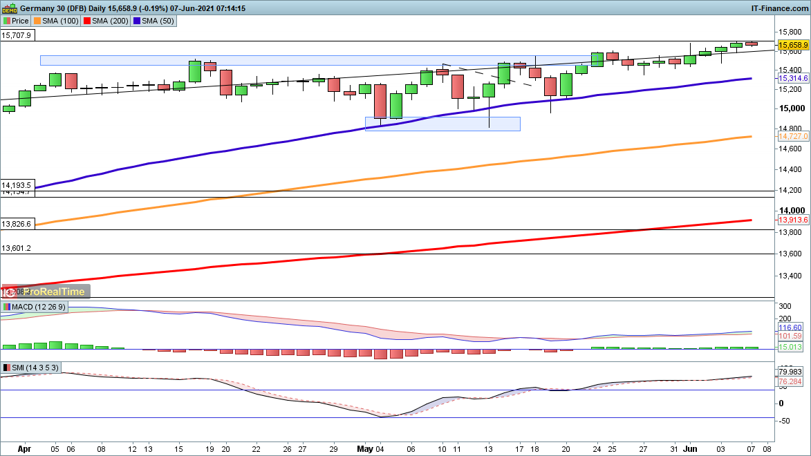 After last Tuesday’s drop back from the highs, the DAX steadily recovered lost ground and now sits just below Friday’s new record high. The upward move remains firmly in place, with sellers needing a drop back below 15,400 to suggest that they have regained short-term control.