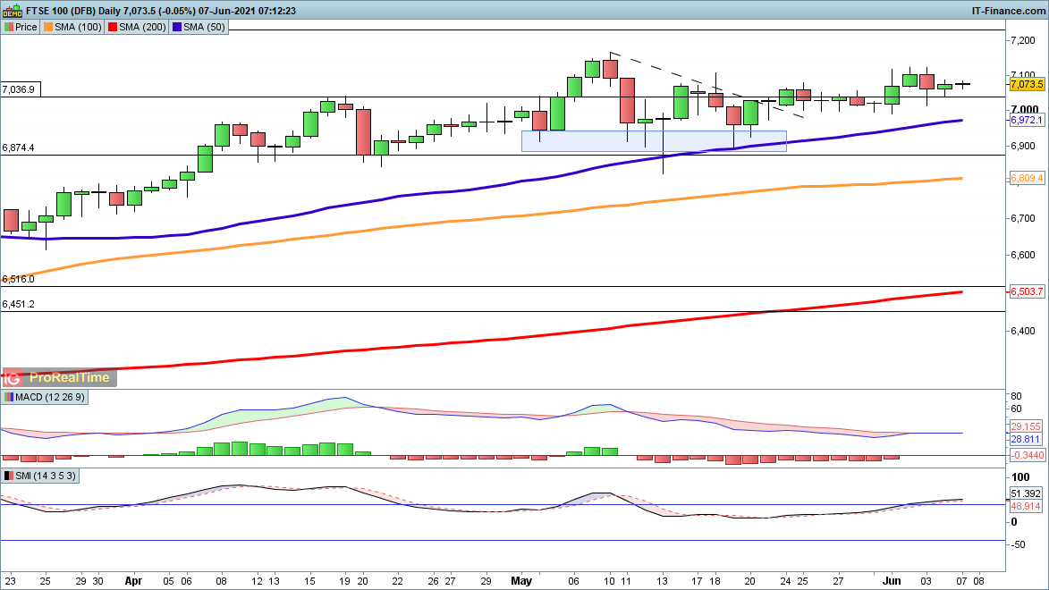 Friday saw the FTSE 100 stabilise after Thursday’s losses, with some small gains on the open so far today. Bulls still need a close above 7100 to provide a firmer indication that they remain in charge, and to open the way to 7167 and higher. Sellers, meanwhile, will want a drop back below 7000 to start a more extended near-term pullback.