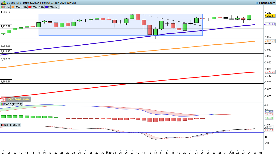 Friday’s jobs report allowed the S&P 500 to make some headway, and put it back on course for 4240 and a new record high. Sellers will want to see the price drop back towards 4157 and move below this level to begin a more extended drop.