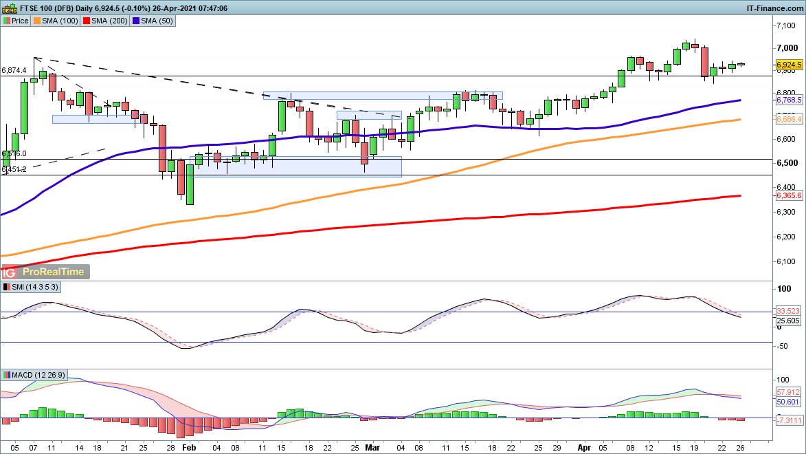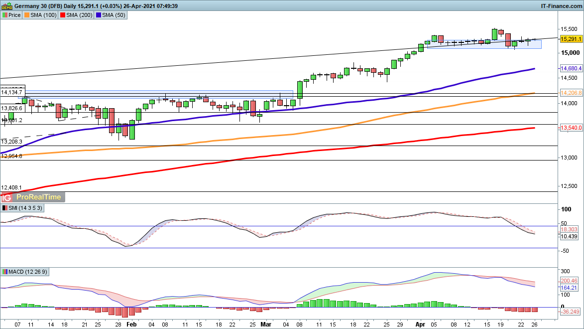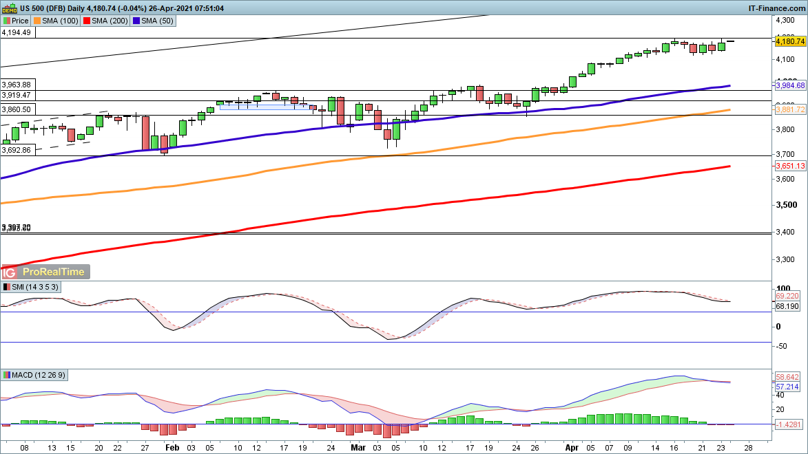 Friday briefly saw the index hit a new record high, as it cast aside any worries about the planned tax increases. A move into a new record high seems likely this week, although with so many big tech earnings on the calendar there is the potential for some volatility at least, if not an outright move lower.