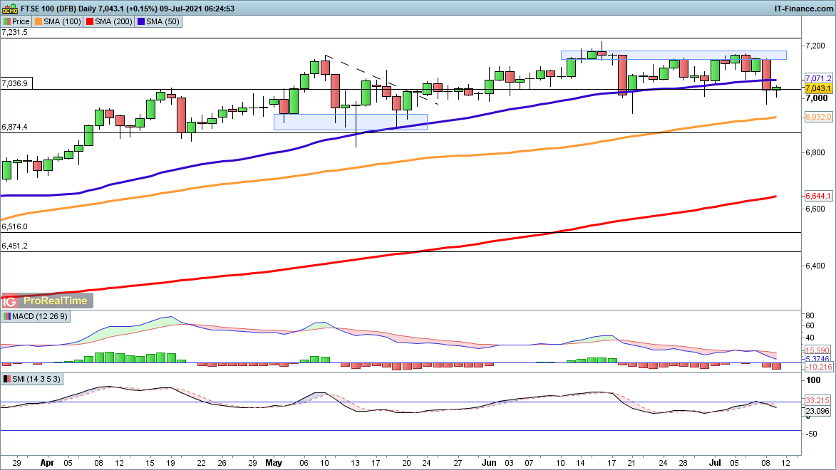 The FTSE 100's uptrend has moved into a trading range phase, as this week has shown. Gains have proven impossible to sustain above 7180, but on the flip side, 7000 remains an area where buyers are wiling to step in. This stalemate could continue for a while, with a break of the range needed to provide the next near-term direction.