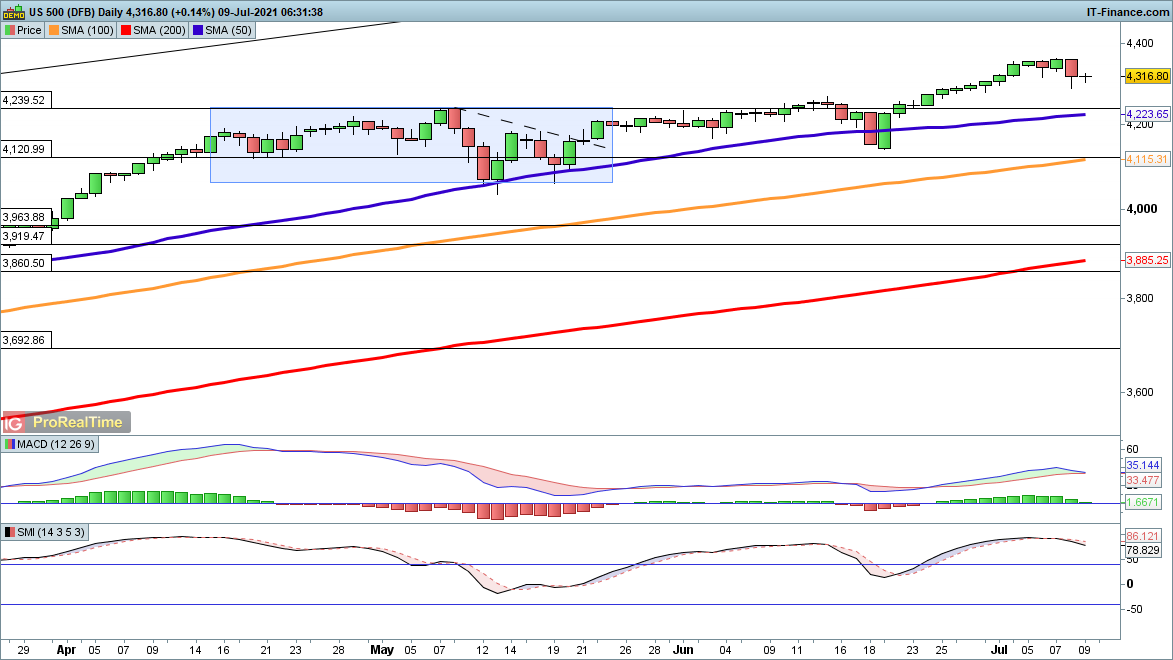 Thursday’s drop was met with some buying that has prevented any further downside for now, but the S&P 500 does remain relatively overextended from the 50-day SMA at 4223. This does not yet look like a dip that has been bought. Further declines head towards 4223, and then on to 4020.