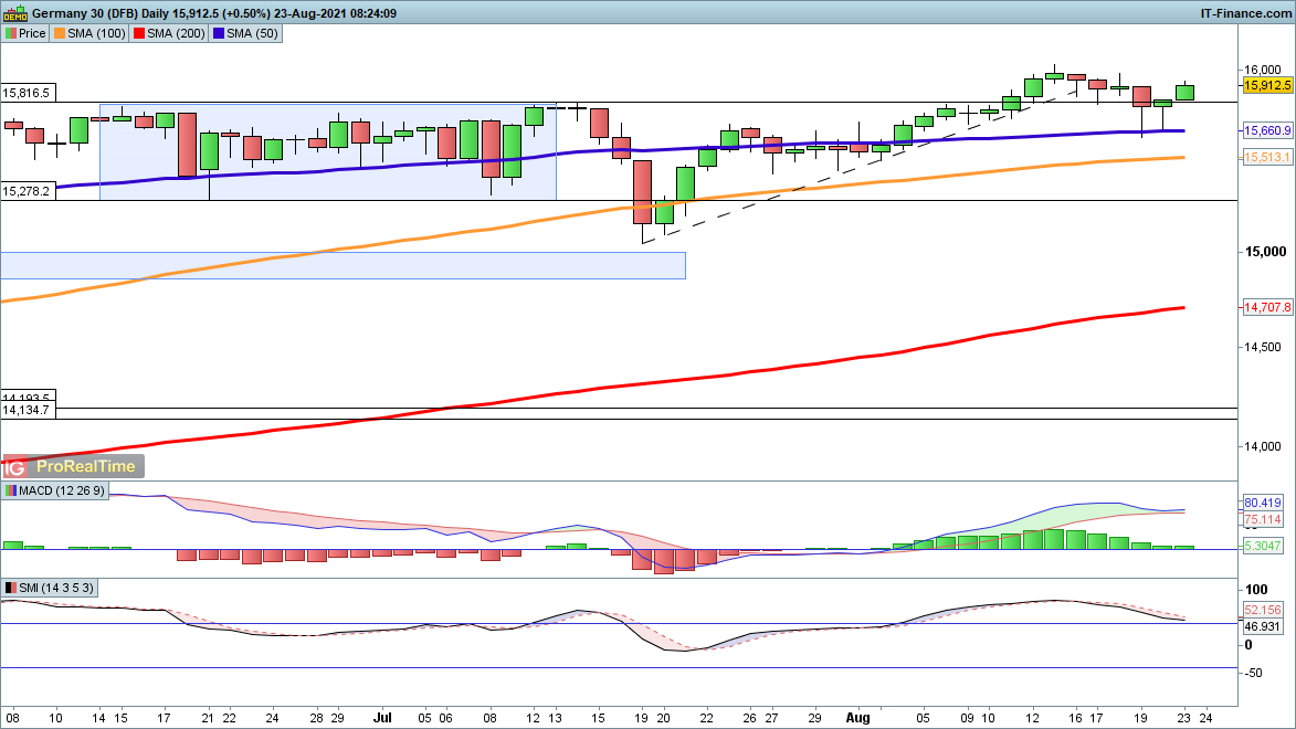 Similarly this index fell towards 15,600 last week and then bounced on Friday. This puts it back on course to 16,000 and to new record highs if bullish momentum is maintained.
