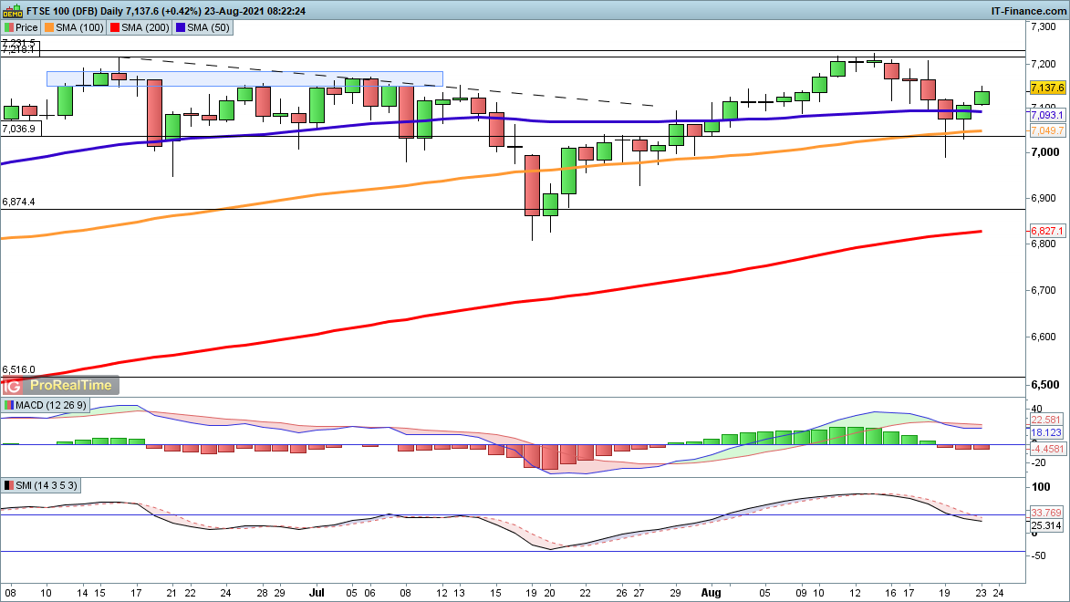 Friday’s bounce saw the price rally from 7036 and then move back above the 50-day simple moving average (SMA) at 7093.
