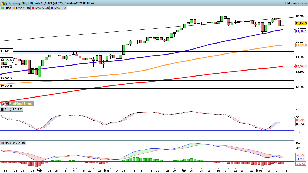 The price has bounced from the 50-day SMA, and as with the FTSE 100 a zone of buying has developed, around 15,000 in the case of this index. Continued defence of this level opens up the possibility of a renewed bounce towards 15,400 and higher. Conversely, a loss of 14,900 and then 14,800 clears the way for a bigger drop towards 14,300.