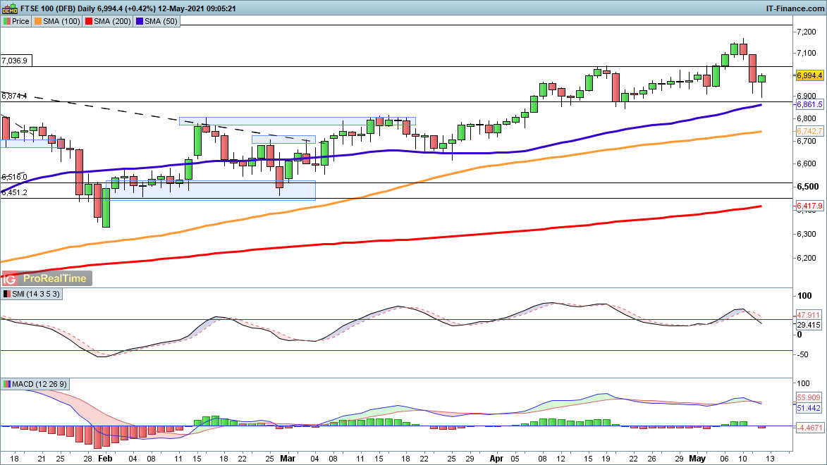 FTSE 100 price action yesterday and so far today has seen the price bounce as it approaches 6900, as buyers step in following the pullback from the arguably-overextended 7150 level. If this area, and 6860, can continue to hold, a new low may develop and a fresh push higher will result. Further declines below 6860 open the way to the 100-day SMA at 6742.