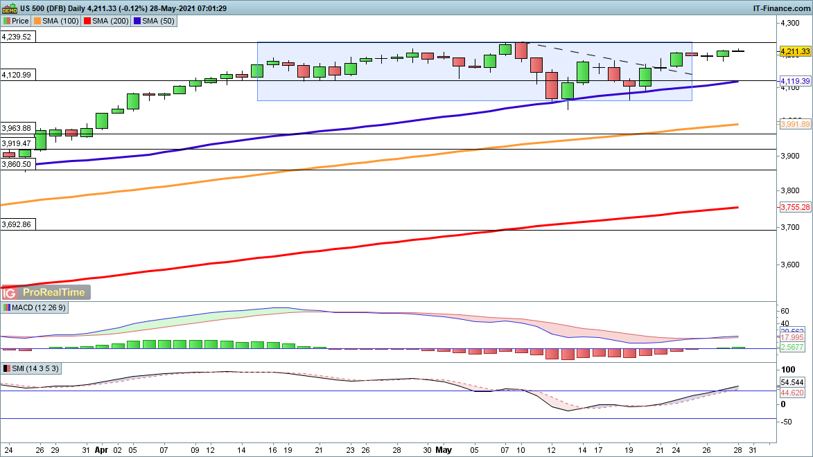 A revived move higher for the S&P 500 on Thursday puts the price back on course to hit 4240, with the bullish view still in charge even with the lack of movement this week.