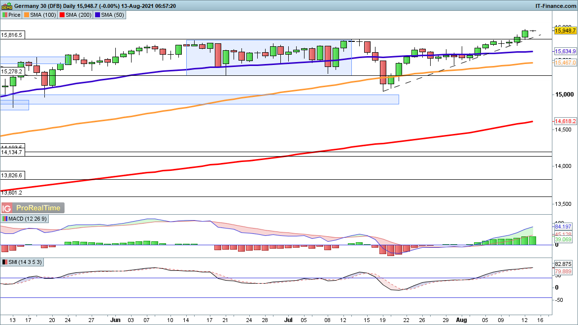 The DAX has finally broken out above June and July resistance, opening the way to new record highs and a potential capture of the 16,000 level.