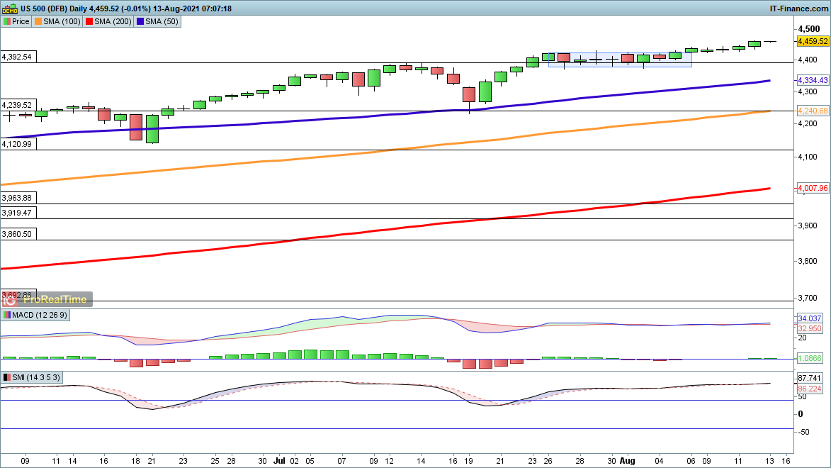 The S&P 500's upward drift continues with no sign of a reversal, as the price sets yet more new record highs.