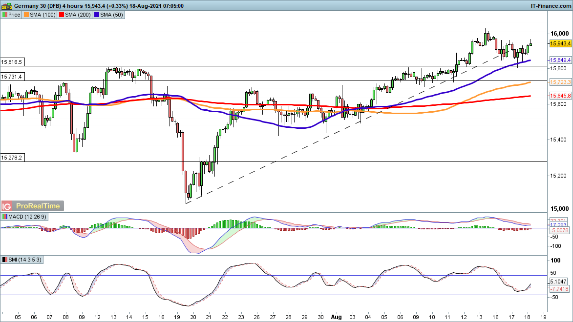 Support came into play around 15,850, with the price creating a higher low above the 50-period simple moving average (SMA) of 15,849. A renewed move above 16,000 now looks likely, leaving sellers once again to wait as a new move to record highs begins.