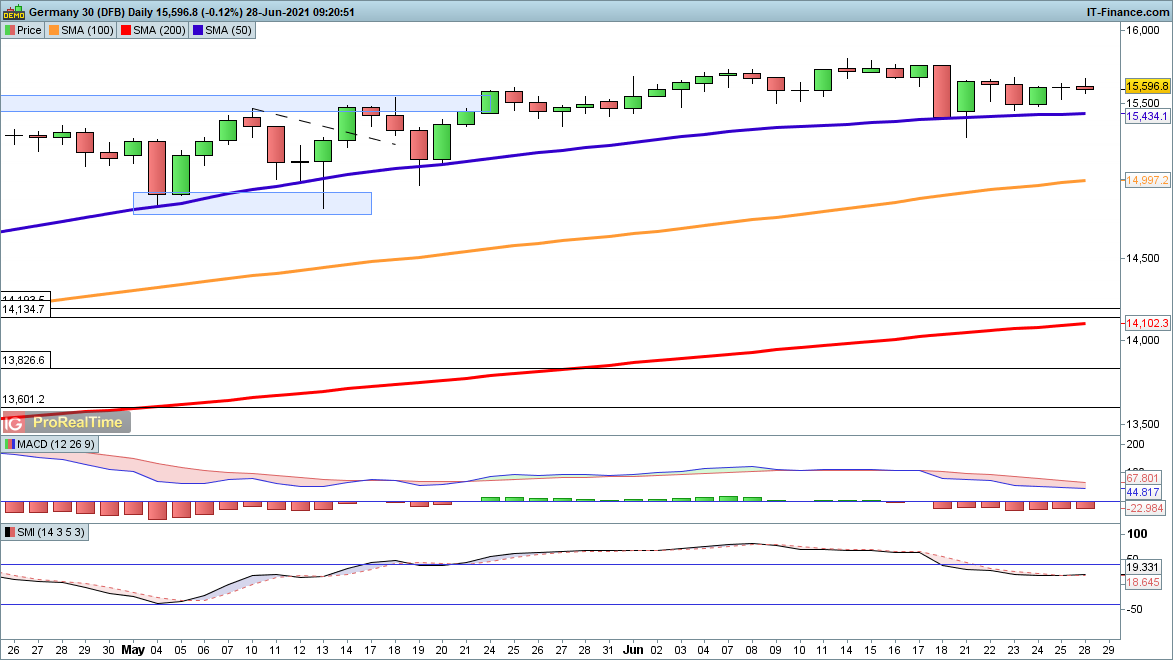 The DAX's bounce has run out of steam for the time being, although it has yet to turn into anything more serious. Overall the bullish view is still in place, but this would begin to change with a move below 15,400.