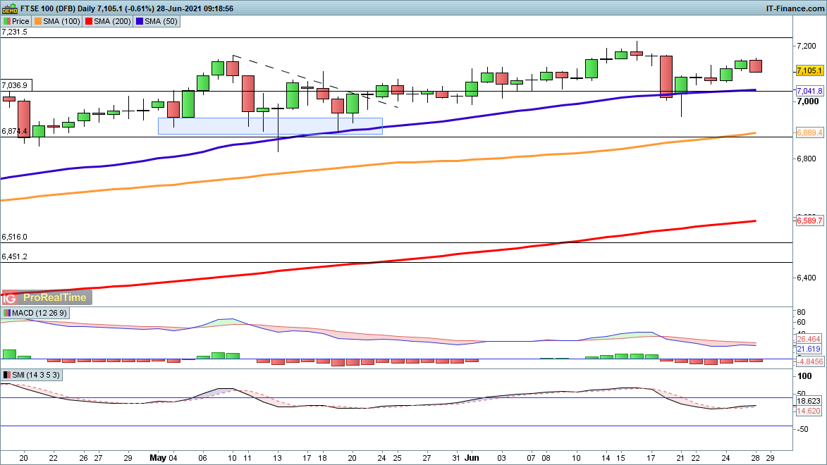 The FTSE 100's upward move has encountered a check, faltering at 7100 and edging lower. Further declines below 7050 would cement a more bearish view and open the path to 7000 and lower. Bulls will be looking for a move back above 7150.