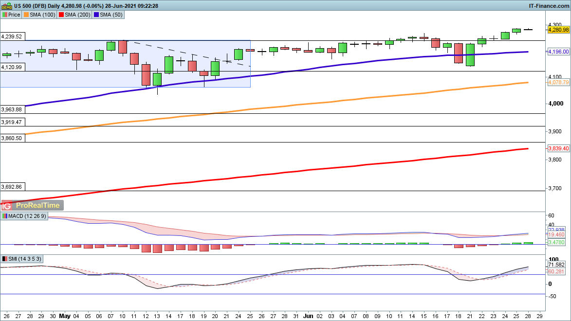 This index roared to a new high last week, and remains close to the peak in early trading. The bounce back above the 50-day simple moving average (SMA) of 4196 put the buyers back in charge, a position which remains the case in early trading today.
