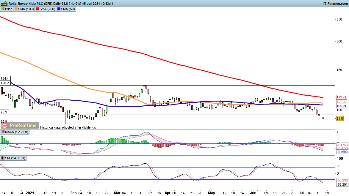 The price remains below the 200-day simple moving average (SMA) at 113p, and while this is flattening out it continues to provide a more bearish view, and recent losses below 95p put 87p and then 65p into view as potential targets to the downside.